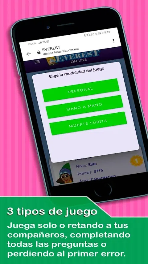 Everest Online可让您通过游戏化来加强组织内部的培训。 是开展宣传活动,培训或加强企业文化的理想之选。 您的协作者可以随时随地播放它。 挑战,要点和水平将使学习变得有趣。 您可以单独玩游戏,也可以在面对面或突然死亡的模式下挑战合作伙伴。 作为管理员,您可以上传无限数量的问题和玩家,并可以查看或下载游戏统计信息。 此外,我们可以帮助您生成广告系列的问题和答案,并使用公司的颜色和徽标来个性化界面