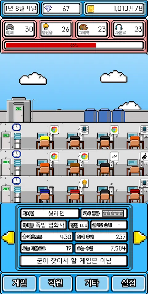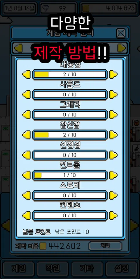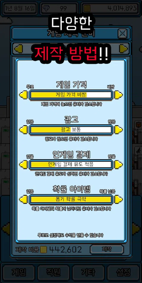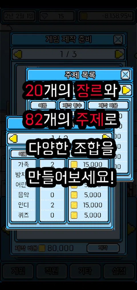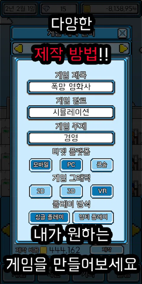 您还记得任何游戏吗? 我很小的时候就很喜欢的游戏,真的很喜欢和喜欢的游戏,但是由于缺乏操作或没有更新而感到失望。您想再次玩游戏吗? 还是我想再次制作的游戏? 如果我认为自己会做一个比这更好的游戏怎么办? 这次自己动手! 这次是游戏!爆炸系列又回来了! 经营自己的游戏公司,并创建世界上最好的游戏! 经营一家游戏公司20年并创建多个游戏 并制作世界上最好的游戏,并将其发展为最好的公司。 各种生产方式 各种流派和话题 您可以自己选择20种流派和82种主题 您可以通过多种组合制作电影。 3种目标平台 您可以使用3种类型的平台制作游戏:移动/ PC /游戏机 创建一个多平台的游戏! 游戏画面 从2D / 3D / VR中进行选择以创建游戏 满足各种用户! 播放方法 从单人游戏/多人游戏中进行选择,以创建各种游戏! 计费方式 以各种方式创建游戏,例如游戏价格/广告/付费项目/概率项目!那不是太多的账单吗? 不断更新 游戏已构建,尚未结束!不断更新,不要让用户失望! 游戏世界之花!年度最佳游戏奖! 在每年的最后一天,将举行“最佳游戏奖”! 让我们创造世界上最好的游戏