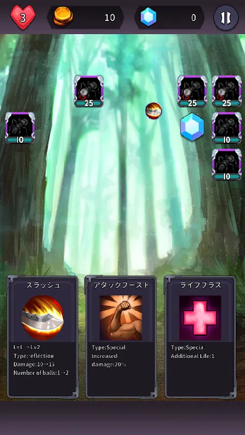 - 游戏特色 - 技能方块破坏者是一款不寻常的方块破坏游戏,它使用扩散、穿透和爆炸等不同能力来击败方块(敌人)。 游戏免费。 但是游戏中会显示广告。 - 技能选择 - 当您获得出现在关卡中的卡时,您将获得三个随机选择的技能候选人。 您可以升级现有技能或获取新技能