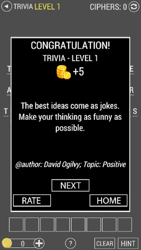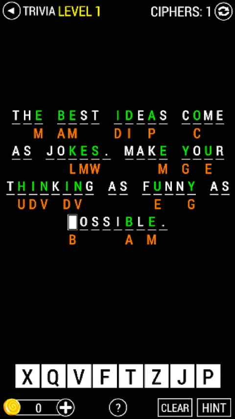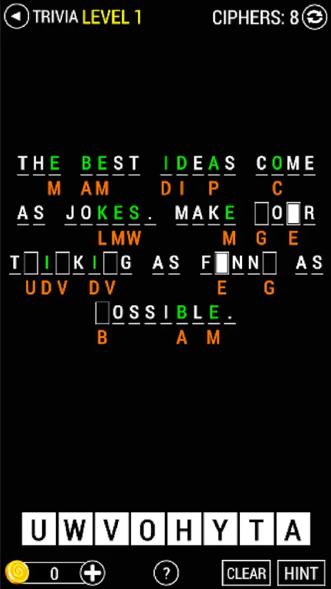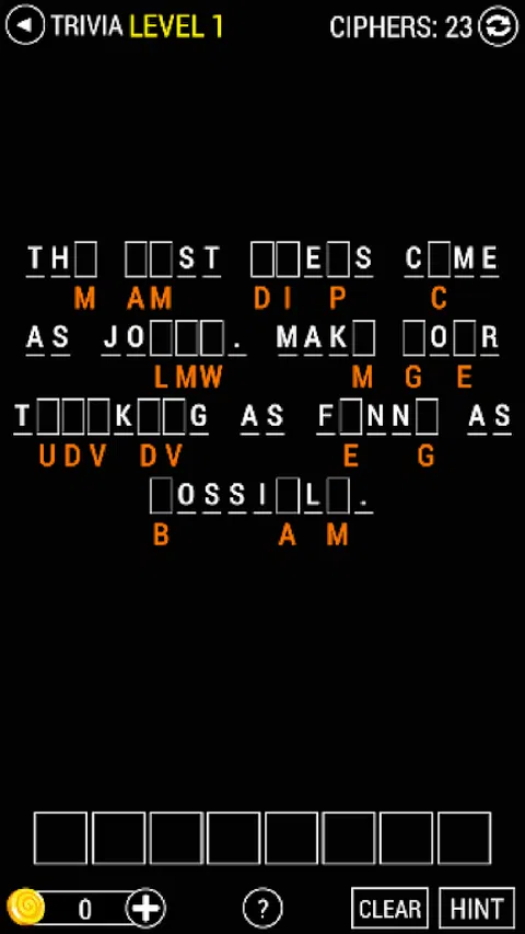 如果你喜欢名言,那么你一定也喜欢这个游戏。 这个游戏是基于报价的。玩家必须在空白处(空白矩形)填写一个正确的字母。查看空白区域下方,您会看到一个橙色字母,它是上面查找到的字母的代码。每个字母都由不包括其本身的另一个字母加密或编码。 游戏分为五个级别,五个包。让我们从最简单的:琐事开始,然后您就会沉迷于这个游戏。 请随时在这里提供您的反馈,并记得评分 5 星并分享给您的朋友