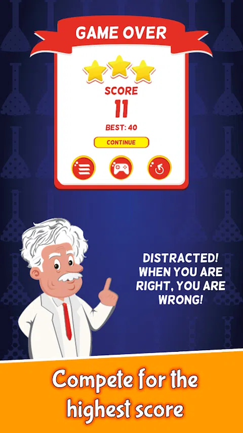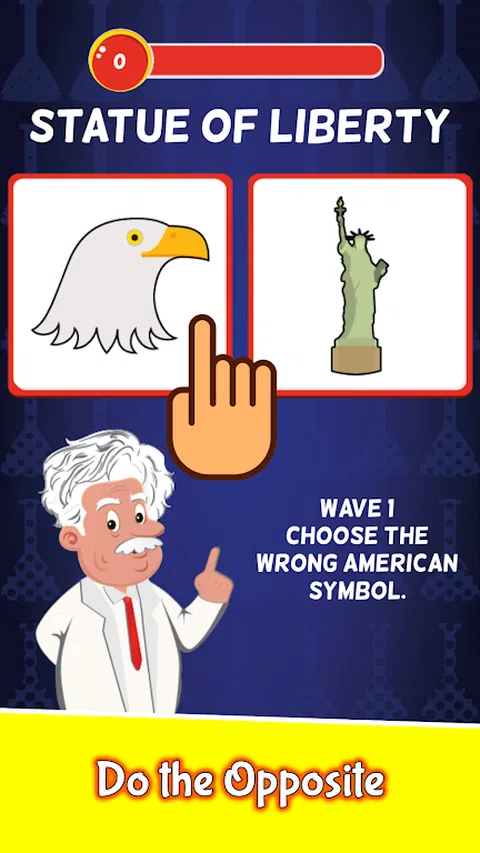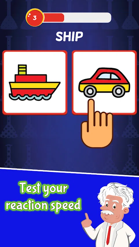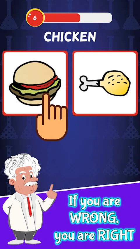 在规定的时间内选择与屏幕上的文字不匹配的图像就得分!记住哦!选择[错误]的图像才[得分],选择[对]的图像就[输了]!挑战你对自己大脑和行动的控制力,抵制本能的诱导。 这算是世上最简单的选择游戏了吧,但能得高分的人可不多哦! 游戏玩法: 屏幕上方出现文字:例如“大象“, 屏幕下方出现两个图案以供选择:例如大象和狮子。单击狮子图像就得分,单击大象图像游戏结束。 屏幕最上方是时间,你必须在时间结束之前作出选择,否则游戏结束。随着游戏的发展时间会越来越短。 游戏特色: 游戏玩法超级简单,单击选择错误的图像即可。 抵制本能,与想做的事相反。 快节奏,考验反应速度。 游戏适合任何年龄段,可以在任何时间和场所玩。 超上瘾,玩起来根本停不下来!超级不甘心如此简单的游戏却得不了高分!哈哈哈