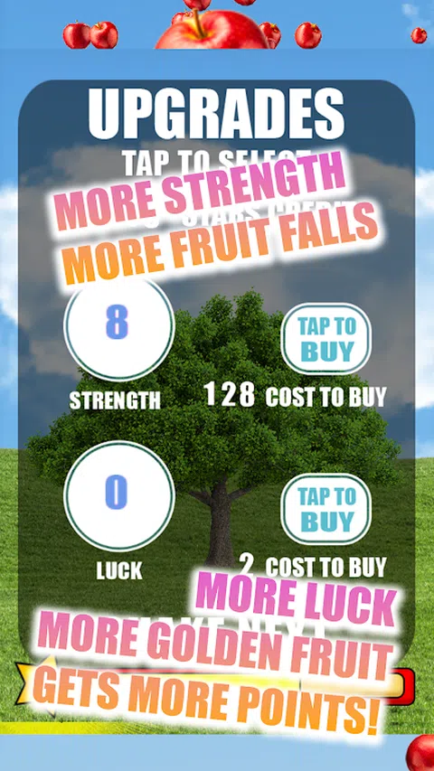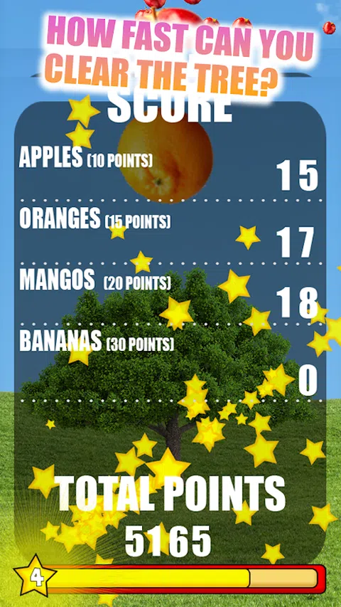 有几分钟可以杀死?摇动那棵树!也许您在玩游戏时甚至会燃烧几卡路里. 尽快清除果树。 从树上敲下每个水果,您都会获得积分。 您会因花费太多时间而失去积分。 为黄金水果获得更多积分! 积分可为您赢得每个级别的星星。当您升级时,解锁升级,例如更大的摇动力量以更快地敲打水果,或更多的运气使树长出更多的金色水果! 与您的朋友在线竞赛,获得跨平台高分,Apple vs Android