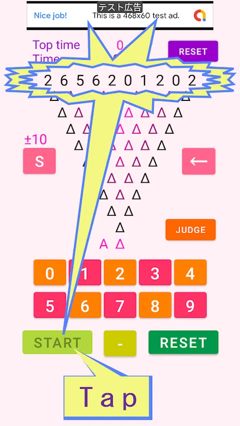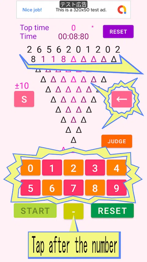 为了将连续的两个数字相加成为一位数,使用 S 按钮选择的 ±9 到 ±18 进行加减运算,并将一位数排列成三角形。 示例)1 + 9-10 = 0 示例)-1 + (-9) + 10 = 0 点击开始按钮排列数字。将 10 个数字中的 2 个添加到三角形的第一行,然后输入下面的数字。 ・ 要在屏幕底部显示导航(△ ◯ ▢)按钮,请从下方屏幕外向上滑动以显示它。 请使用默认(标准)显示(屏幕)设置。如果屏幕上的字符很大,它们将无法正确显示。 ・ 轻触 S 按钮选择要为±(调整)、±9 至±18 的数字。 将两个数字连续相加成为一位数。如果相加的数字变成两位数,则使用±9至±18使其成为一位数。点击要使用的数字的S按钮。然后选择。选择±10,如果一行中的数字是1和9,1 + 9 = 10就是2位数,所以减去10,输入1位数0。 ・点击开始按钮开始游戏。 当您按下开始按钮时,要计算的数字排在第一行,时钟开始计时。 从第二行开始,将上面排列的两个数字相加,如果是一位数,则保持原样。点击以排列一位数。 当计算出的数字变为负数时,使用 0-9 按钮输入数字,然后点击 START 按钮旁边的 - 按钮使其变为负数。 *详细解释* 如果连续的两个数字是 5 和 2,请点击 5 + 2 = 7 的 7 按钮并输入 7。 如果用 S 按钮在 9 和 9 中选择的数字是 ± 10,则 9 + 9 将是 18,它将是 2 位数字,因此通过点击按钮减去所选的 10 输入 8。 对于 -9 和 -9,用 -9 + (-9) = -18 选择的数字是 ± 10,用 -18 + 10 = -8 点击 8,然后点击减号按钮使其变为 -8。 ・如果输入有误,请点击←按钮返回并更正。 如需更正,请点击 ← 按钮一次以返回一个数字。 ・排列完成后,按下JUDGE按钮进行判断。 将数字排列到 A 的顶部后,点击 JUDGE 按钮。时钟将停止,答案的数量将出现在 A 旁边。如果您不按 JUDGE 按钮,则不会给出任何答案,时钟也不会停止。如果你犯了错误,猫会✕? - 点击下方的 RESET 按钮初始化屏幕。 点击屏幕底部的 RESET 按钮将输入的数字返回到第一个屏幕。如果您想在游戏过程中结束游戏,请点击 RESET 按钮重置屏幕。 ・ 再次点击开始按钮以显示最早的时间。 通过点击屏幕底部的 RESET 按钮进行重置后,如果您按 START 按钮,最早的正确答案将与数字±一起显示在 Toptime 中。不显示答案错误的时间。 ・ 点击 Toptime 旁边的 RESET 按钮以重置顶部时间。 ☆ 享受激活大脑并加快计算速度的训练游戏