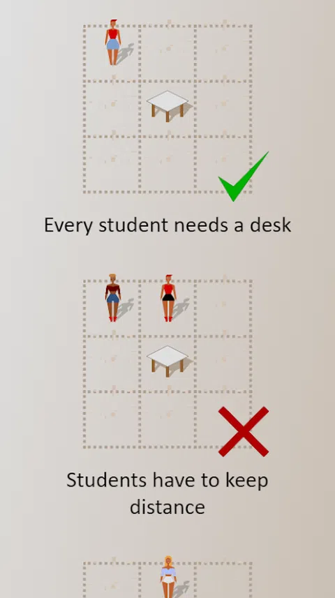 每个教室的课桌数量与学生数量相同。课桌是固定的,您可以为每个学生提供一张课桌,但要与其他学生保持安全距离。 共有三个级别,教室越来越大,可坐的学生越来越多。“简单”大约需要一分钟,“中等”大约五分钟,“困难”…好吧,祝老师好运