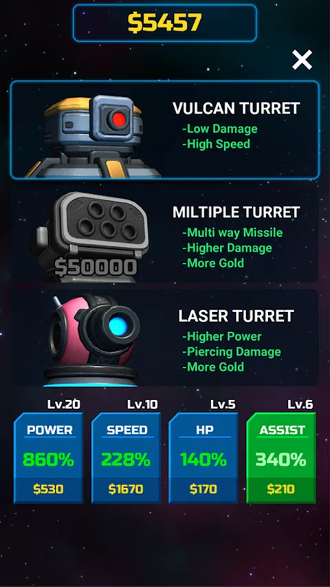 地球防卫军安装了炮塔塔防御,为外星人入侵做准备。 随着时间的推移,外星人的入侵平静下来,平静的日子继续下去。 然后有一天。 地球的未来掌握在你的手中。 炮塔冲锋特点 - Turret Rush TD 是一款闲置塔防游戏。 - 看看色彩缤纷的各种炮塔导弹。 - 购买各种炮塔,升级你的力量、速度和生命值。 - 升级副炮塔将帮助你保卫你的基地。 - 购买并升级各种炮塔以应对具有挑战性和无尽的波浪。 - 当炮塔塔上的仪表充满电时,用水龙头发射一枚特殊导弹。 - 无需互联网连接。甚至无线网络。 队长!拯救地球