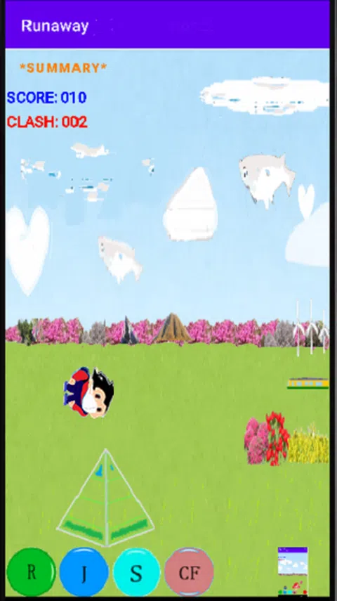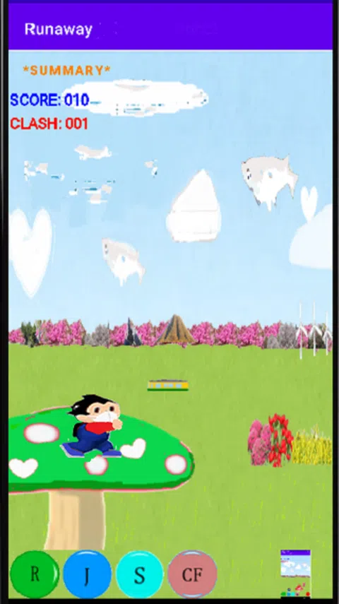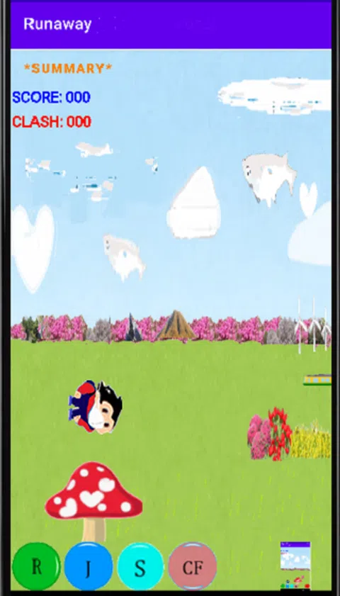 按钮操作: R:这是游戏的开始,你可以从中间开始。 J:角色跳跃,跳跃的高度根据你按下它的时间而变化。 S:角色会旋转并上升,如果您击中移动的云,您的分数会增加。 CF:向前爬行,用于躲避鸟类攻击。 1) 点击底部按钮向前移动。 2) 点击顶部的按钮返回原始状态。 如果你点击圆形蘑菇前面的角色,屏障就会起作用。 垂直图像:在垂直方向或水平方向玩游戏时,点击以制作水平图像。 添加了一个返回屏幕右上角的按钮。 屏幕底部添加了一个音源按钮(音符)。 1) 如果音符是彩色的,将输出背景音乐和声音效果。 2) 如果音符是黑色的,则将背景音乐和声音效果静音