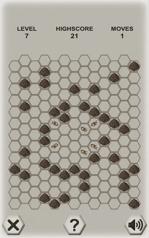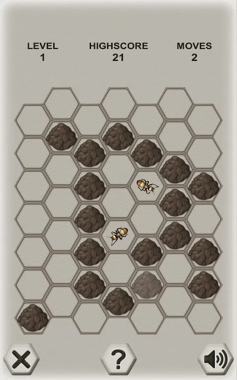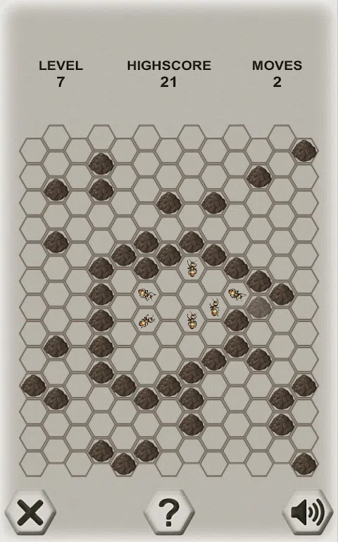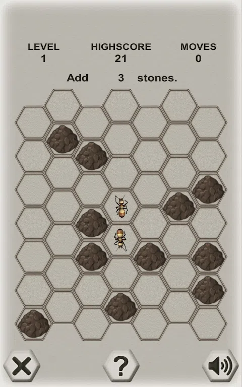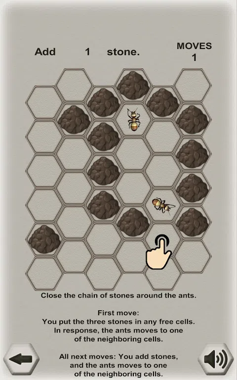 这是一个逻辑的游戏,你正在与一个聪明的对手 - 蚂蚁战斗。 你的目标是关闭蚂蚁周围的石块。 蚂蚁的目标是逃离场地。 你交替地做出动作: 第一个举动是由玩家做出来的:你把三块石头放在任何一个自由的细胞里。 作为响应,蚂蚁移动到相邻小区之一。 所有下一步:你添加石头,蚂蚁移动到一个相邻的单元格。 您的目标是切断所有可能的出口。 捕捉蚂蚁