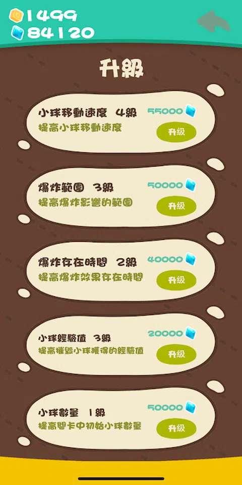 等待合适的时机,点击屏幕制造爆炸 爆炸、时机、空间、速度、流动、愉悦。我们希望你在压力下释放出你需要释放的一切。 在蘑菇云的爆炸消失之前,流球一旦接触,就会引发连锁爆炸。 尝试诱导一条链条引爆少量可能的球。 引爆球数量达到标准即可通关,并且不会获得经验提升爆炸效果。 引爆小球收集金币和钻石,可以升级你想要引爆的形象。 升级各种属性,帮助你取得更高的成绩 1.球移动的速度:球流动的速度越快,越容易击中爆炸云,引发连环爆炸。 2.爆炸范围:影响爆炸蘑菇云的大小,让爆炸威力扩大到更广泛的范围 3.爆炸时间:爆炸总是会慢慢消失。这个升级可以让你的爆炸影响时间更长,更容易引爆其他小球。 4、小球经验值:连续炸小球经验值翻倍。此次升级将为您带来更多体验。利用经验提升更多能力 5.球的数量:一个关卡的球数量当然是尽可能多的