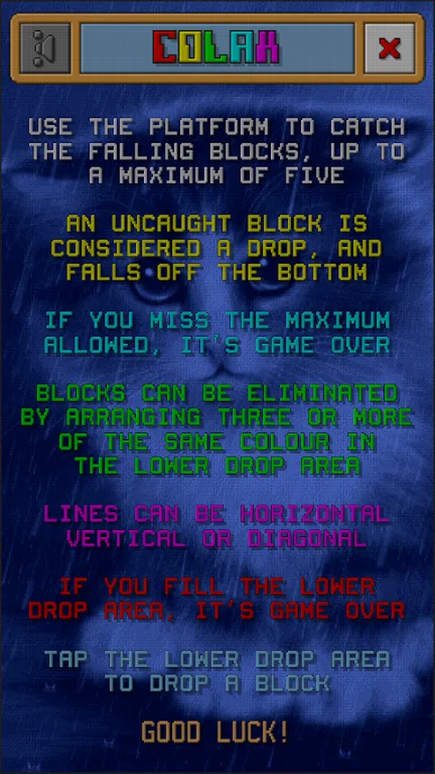 使用平台来捕捉掉落的方块,一次最多可以携带五个。 一个未被抓住的方块(你在平台上没有抓住的方块)被视为掉落,并从底部掉下来。 如果您错过了允许的最大方块数(目前为 20),则游戏结束。 可以通过在较低的掉落区域中将三个或更多相同颜色的物体排成一条线来消除方块。 线条可以是水平、垂直或对角线。如果您正确规划,可以同时制作多条线。 如果您填满下方的放置区域,该区域可在 5x5 网格中容纳 25 个方块,则游戏结束。 使用左右按钮移动平台。当平台位于要放置方块的列上方时,点击下方的放置区域。 记住:只有5列,但有7个不同颜色的方块…提前计划! 祝你好运