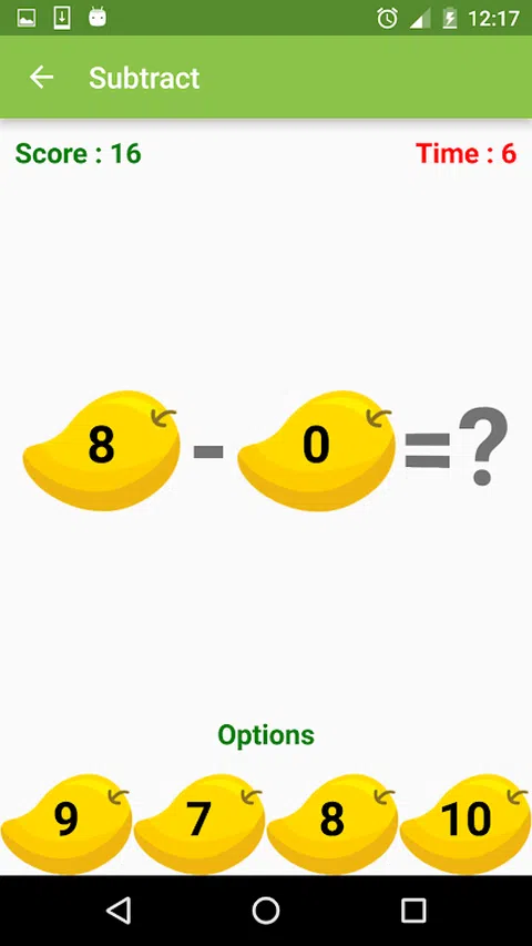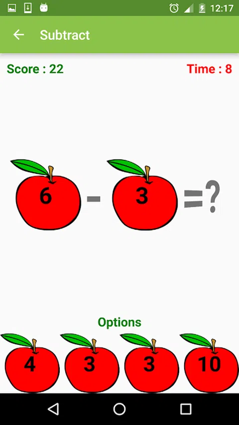 减法儿童允许孩子们选择减法练习的简单、中等和困难级别,以掌握相同的知识。这是一款适合您孩子的教育数学游戏,也是完美的减法数学练习。 » 选择一种水果,游戏会出现 4 个选项,从正确答案中选择 » 您必须在指定时间(10 秒)内回答。 » 如果过了一段时间仍没有答案,则当前的减法练习将被跳过,您的分数将减少 2 » 如果回答错误,练习将立即结束 » 您可以查看您孩子进行的减法练习的历史记录。 孩子们通过自己选择的水果游戏进行教育