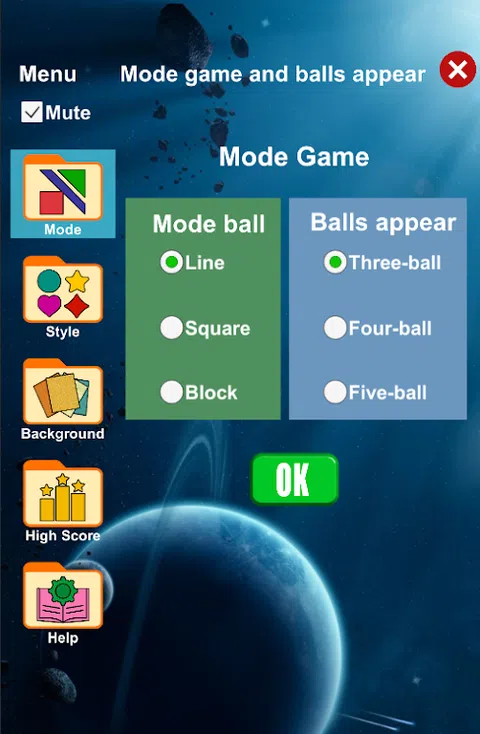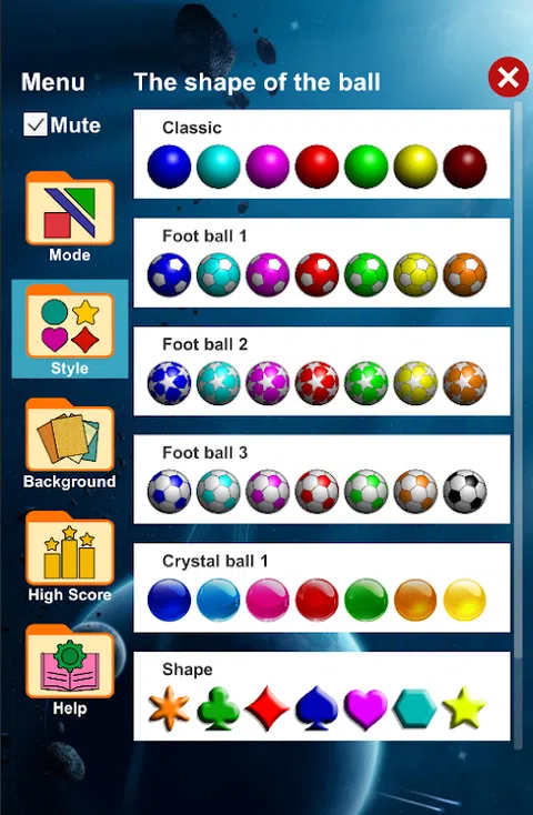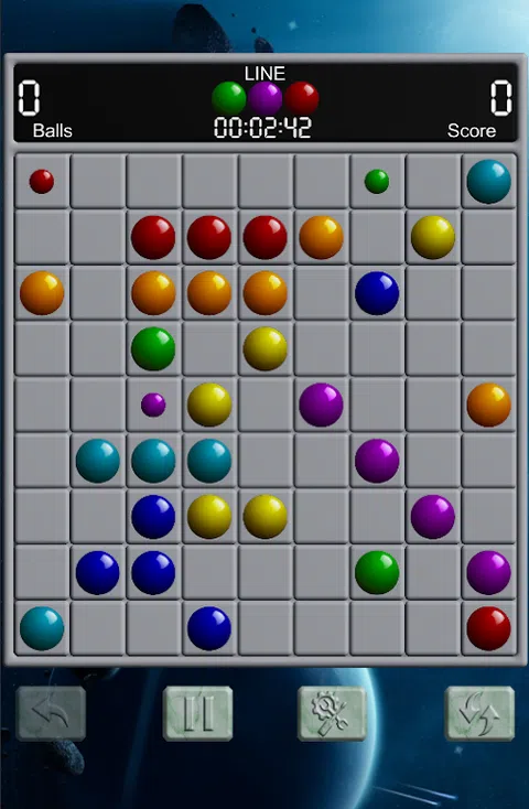 根据游戏模式的要求排列相同颜色的球。 有3种游戏模式: +线:将至少5个相同颜色的球排列成行、列或对角线。 +正方形:将相同颜色的球排列成正方形或矩形。 +方块:排列至少7个相同颜色的球,使它们彼此相邻