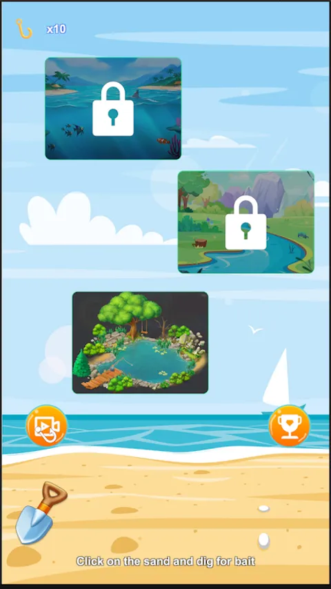 体验休闲钓鱼,收集各种鱼类。点击主页上的沙滩,挖洞倒饵。然后去不同的区域钓不同的鱼。点击放下鱼钩,钓到你最喜欢的鱼。右侧的按钮可让您查看您的鱼收藏。