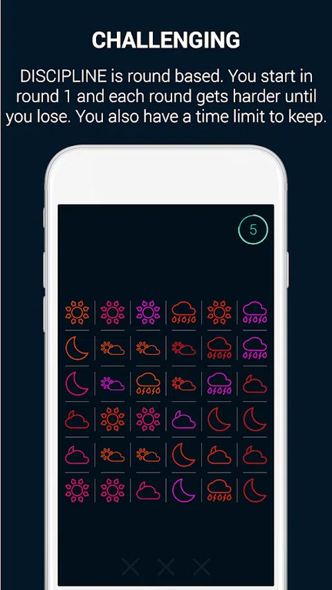 开始新的一天或享受您的空闲时间 纪律 确保您不仅会玩有趣的休闲游戏,还会利用有趣的 大脑训练集中力游戏 到 提高注意力 立即免费下载并通过每日有用的游戏来治疗您的大脑 怎么玩 1. 每轮至少显示 1 个需要从混合符号/对象网格中删除的符号/对象 2. 你需要移除这些符号和物体而不接触其他的 3. 每轮有时间限制 提高记忆力、注意力和注意力 从本质上讲,Discipline 是一款简单但具有挑战性的记忆力改善大脑训练游戏,可训练注意力和集中力。将其视为一项日常大脑锻炼,可以在空闲时间为您带来乐趣,还可以增强您的注意力、注意力和记忆力。随着你的进步,你会发现你的注意力、记忆力和玩这款精致的休闲注意力游戏的技能会越来越好