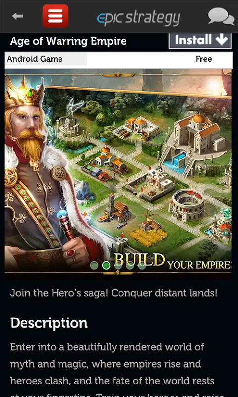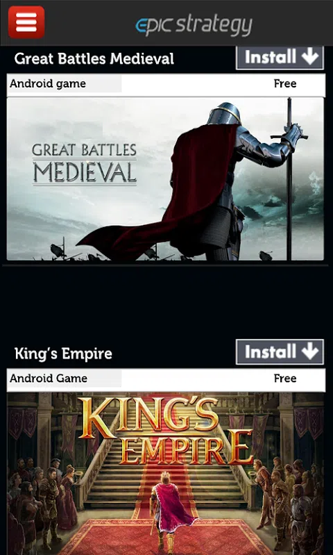 回到中世纪时代,那时候史诗战争和强盛的帝国并存,采取策略建立您的王国。 这款应用收集了卓越的史诗级策略游戏。您可以在应用里查看各个游戏的评论和视频,但是您并不能直接在应用玩这些游戏。如果您有因特网连接,通过点击“安装”按钮您会被转到安卓市场相应的游戏页面进行安装。 我们的目标是为您提供查找和安装最优秀的史诗战略游戏的另一途径。我们的编辑持续关注安卓市场最新发布以及最近更新的史诗策略游戏和塔防游戏。游戏列表持续更新以包含最新发布的游戏。这些游戏被划分为免费、付费和星级类别,以使查找更加容易和便捷。 史诗策略游戏不同于其它策略游戏以及战争游戏,因为它以中世纪时代为时间背景。游戏的目标是建立您自己的帝国、国民,征服其它王国。同时也需要防御其它王国的侵略。 应用里既有充满部落与氏族战争的石器时代的游戏,也有充满帝国与王国战争的中世纪时代的游戏。不管是哪一种游戏,到处都充满了战争与较量。加入某一作战方或者作为一名指挥官或者作为一个王国,制定策略来建立您自己的军队和城堡。您会碰到一些基于诸如罗马高卢战争的即时策略游戏。制定策略来捍卫您的城堡或者登基成为国王。 特点: - 每日更新 - 最优秀游戏的私人收集 - 史诗战略游戏完整列表 - 星级类别包含了编辑精心挑选的优质游戏 - 最受欢迎和最新发布的史诗策略游戏 - 基于简介目的游戏屏幕截图 - 集各种各样史诗策略游戏于一体的应用 - 便于查找安卓市场最受欢迎和最新发布的史诗策略游戏 - 友好的用户界面设计 - 文件体积小于1M - 安装快速 - 几乎与所有的安卓版手机和平板电脑相兼容 关于我们列表上的游戏: 请注意我们列表上的一部分而不是全部游戏具有以下特点