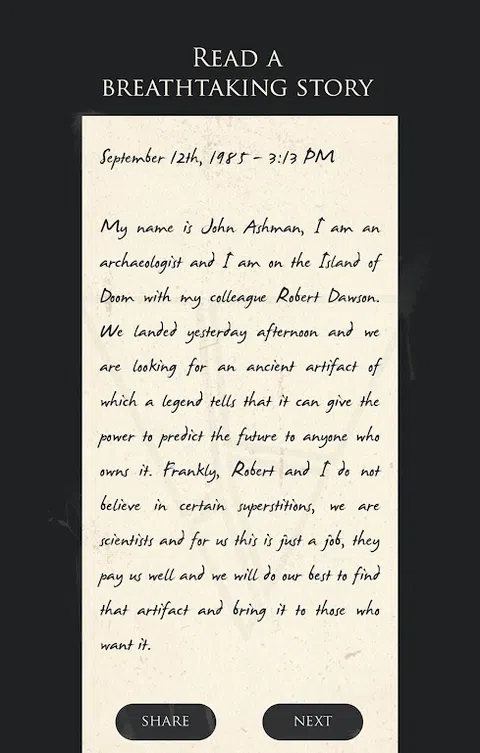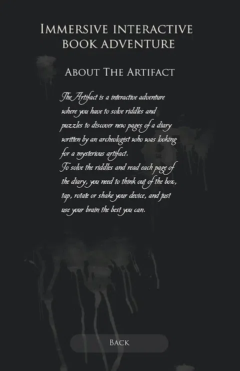 The Artifact 是一款互动图书冒险游戏,您必须解决超过 45 个谜语才能阅读一位考古学家所写的日记的每一页,这位考古学家在和他的朋友寻找古代神器时在一座岛上迷路了。 开箱即用,解决所有谜题,点击、旋转或摇动您的设备,尽可能发挥您的智慧。 如果您遇到某个谜语,请点击灯泡以获得提示。 不要忘记分享您的进展,只是不要公开透露解决方案