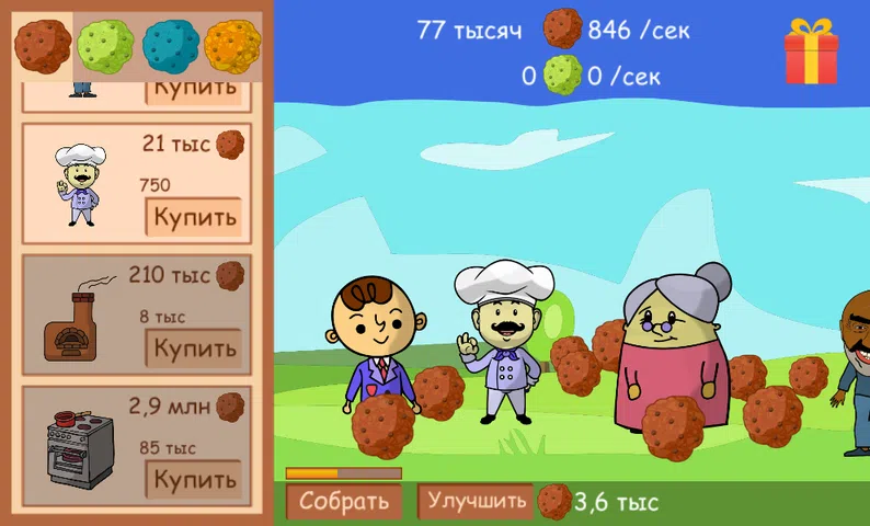 游戏中有一位烘烤饼干的祖母。您可以打电话给小学生、专业厨师或阿肖特来帮助她。他们会做饼干。你雇佣的人越多,他们可以烤的饼干就越多。为了更好地烘烤饼干,您可以购买额外的糕点设备进行烘烤。这是炉子、煤气炉、微波炉或工业输送机。 所有糖果制造商都可以不间断地工作而不会感到疲劳。工人的资质不同。他们可以烘烤 4 种不同类型的饼干。 最贵的是金色饼干,虽然不能食用,但由于材质珍贵,所以价值最高。 最便宜的是任何人都可以制作的普通燕麦饼干。 不同类型的cookie可以相互交换。 如果你突然没有足够的设备,或者需要一个新的糕点师,你可以通过抽奖中奖。免费抽奖可以让您赢得更多工人,这些工人将产生比矿场更多的收入。 靠糖果致富。 成为一名成功而富有的厨师,额外的利润等着你