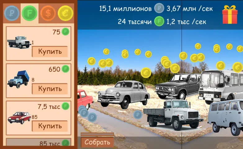 在这个答题器中,您购买俄罗斯汽车。你买的每辆车都会给你带来额外的钱。首先购买破旧的老爷车,然后购买现代的超级跑车和 Yo-mobiles!汽车越酷,带来的钱就越多。购买汽车并建立自己的车队。机器具有不同的特性,可以产生不同的货币。 游戏有卢布、美元、欧元和法郎。按汇率相互兑换货币。游戏中有多种汽车:七、九、三、六、卡玛斯、凹槽。 稀有汽车:Pobeda、Chaika、Rose Royce。 现代俄罗斯公路之王:Lada Granta、Priora、Kalina、Yo-mobile! 出租车司机也不甘落后。他们增加了出租车和小巴。 小巴是 GAZ - 2705 或 Gazelle 汽车! 聪明的出租车司机会工作并为您带来租金收入。 卡车司机使用卡玛斯。那些自上个世纪以来就一直在帕兹克工作的人们。 最酷、最清醒的寡头乘坐飞机以避免交通拥堵。 还可以买战斗机!但在此之前,玉米植物正在等待着您:田地授粉和施肥。不同的巴士和飞行交通工具正在等着您! 买一切并致富