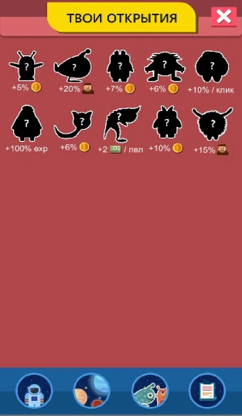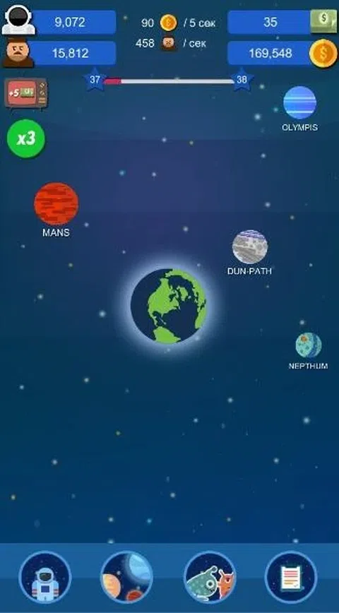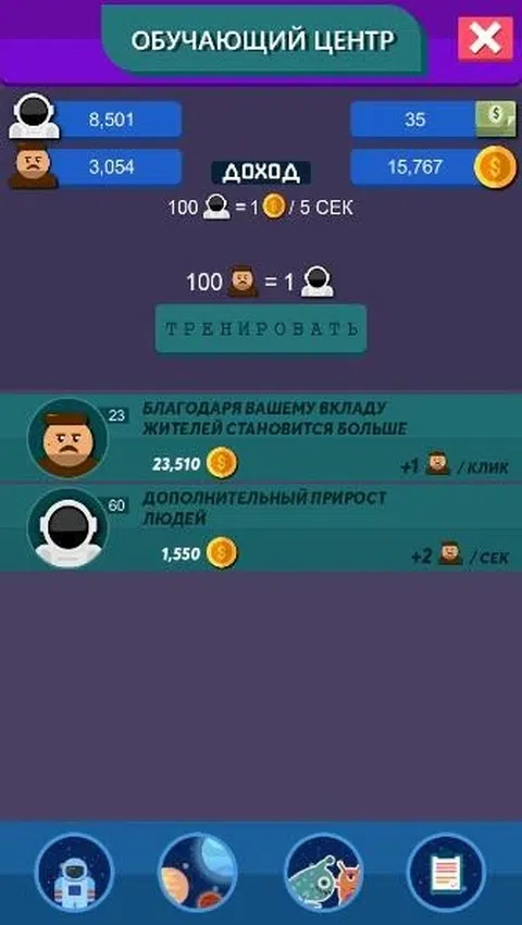 Exploring Space Idle 是一款游戏,您的主要任务是探索太空和外星生物。您需要单击“地球”星球,人类将会出现。此外,他们需要在宇航员部门接受培训,他们会给你带来利润,如果没有利润,研究当然就无法进行。探索太空,寻找新型外星生物,提高你的技能并发现整个宇宙! 一款可让您探索新行星和外星生物的答题器