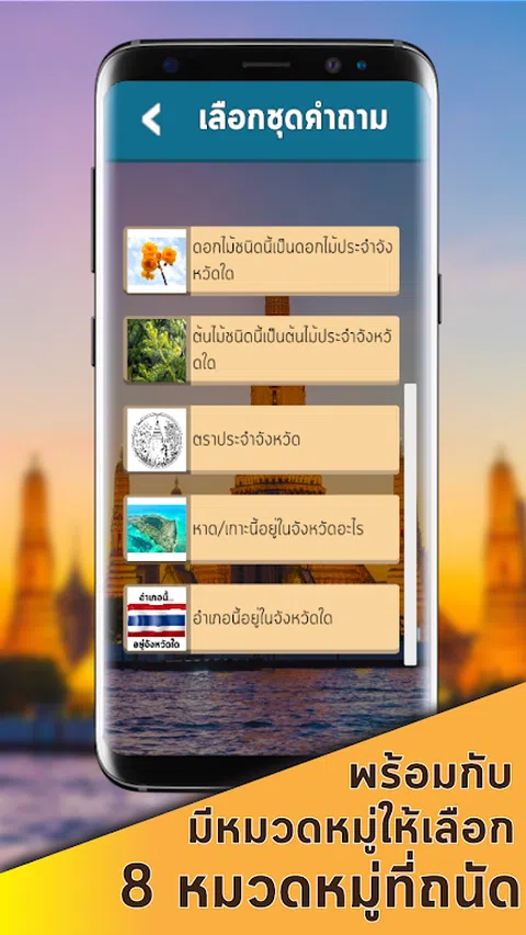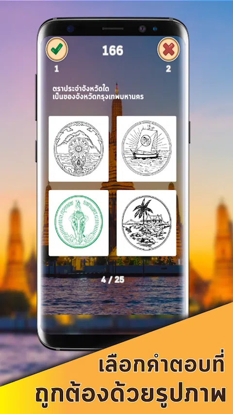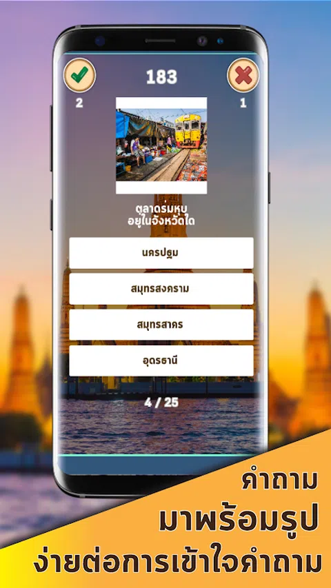 知识测试游戏《问遍泰国》是一款让你了解泰国每一个角落的游戏。将有 200 多个问题可以玩。在游戏中有 8 个类别可供选择,如下所示。 - 这个省在哪个地区? - 这个地方在哪个省? - 这个座右铭属于哪个省份? - 这是哪个省的花? - 这棵树是哪个省的? - 这个省有什么类型的省徽? - 这个海滩/岛在哪个省? - 这个区在哪个省? 这款游戏将帮助您比以往更多地学习和了解泰国。选择正确答案,加载知识挑战~