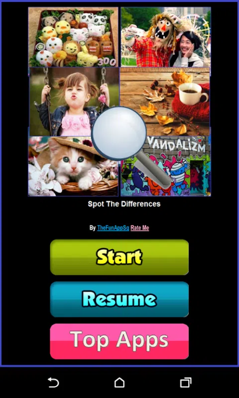 免费挑战寻找不同! 一个有趣的游戏,考验您的观察力。 比较两个图片,并找出五个不同。 高质量并可爱的图片。 共有50个阶段,30个提示。 无时间限制的挑战寻找不同