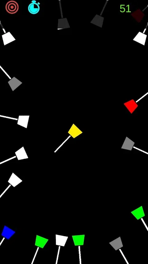 根据难度,通过单击屏幕上的任意位置将不断旋转的针扔到墙上。如果不同颜色的针发生碰撞,则游戏结束,碰撞相同颜色的针会获得额外的分数。 有 18 种不同的针可供选择