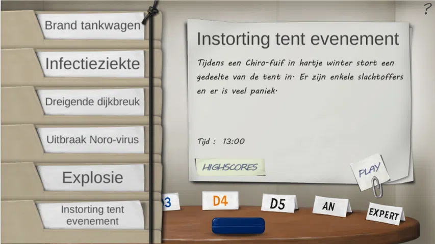 在紧急情况下没有时间可以浪费。所有的头都转向你作为市长来做出重要的决定并做出决定。为了让您尽可能多地做好准备,应急计划与危机管理服务和 Firewolf Studios 开发了这款在线游戏,让您面对一些现实场景。 仅当您从应急计划和危机管理服务收到登录名和密码后才能玩此游戏。 作为一名市长,您在(迫在眉睫的)紧急情况下经常面临两难境地。作为市政危机小组的主席,您最终必须做出决定。幸运的是,在危机期间,您将得到消防队、警察、医疗服务、民防、您所在城市的应急计划协调员等的协助…但是,您的决定总是会在公众舆论和媒体上产生影响