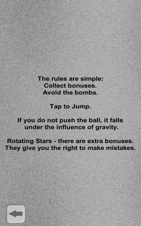 规则很简单: 点击跳跃。 收集奖金。 避免炸弹。 如果不推球,它属于重力的影响下。 红色旋转恒星是额外的奖金。他们给你犯错误的权利。 测试你的敏捷