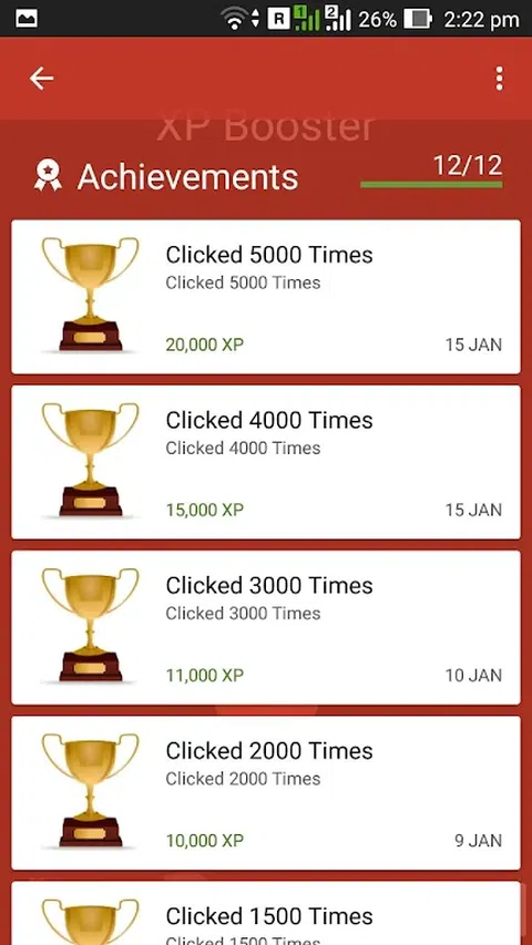 挑战自己,你有多少毅力。 XP Booster2 具有一个简单的计数器,每次单击按钮时计数器都会增加。 看看你能在不生气的情况下点击多少。与您的朋友竞争,看看谁是最敬业的。 点击按钮获得大量 Google play XP。 XP的分布如下:- 10 次点击 - 2,000 XP 50 次点击 - 3,000 XP 100 次点击 - 4,000 XP 250 次点击 - 5,000 XP 500 次点击 - 6,000 XP 750 次点击 - 7,000 XP 1000 次点击 - 8,000 XP 1500 次点击 - 9,000 XP 2000 次点击 - 10,000 XP 3000 次点击 - 11,000 XP 4000 次点击 - 15,000 XP 5000 次点击 - 20,000 XP 让我们看看你能点击多少。