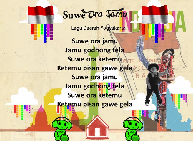 《从沙璜到马老奇的印尼地方儿歌》收录了印尼各地区的歌曲,非常适合儿童和大众,配有有趣的歌词和动画,让孩子边唱边学。收录了10首精选歌曲: 1. 亚姆科·兰贝·亚姆科 2. 香蕉皮 3. 苏韦·奥拉·贾穆 4.边缘的蚂蚁 5. 托克仓 6. 基准 7. 萨里南德 8. 我的山羊孩子 9.库布拉克库布拉克苏翁 10.切鸭鹅 希望这样印尼文化,特别是印尼地方儿歌能够继续得到保存和发展