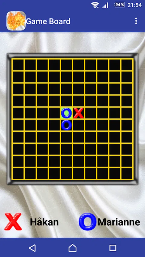 该游戏是关于在对手成功之前连续获得五个,同时您必须阻止对手连续获得五个的尝试。您作为玩家放置的棋子类型是蓝色零或红十字,作为被邀请者,您总是开始然后放置蓝色零的棋子类型。 使用“添加好友”菜单选项添加好友,将显示玩家列表,并通过按任何名称向所选玩家(好友)发送好友请求。收到好友请求的玩家的姓名现在将以黄色背景显示在好友列表中,收到好友请求的玩家现在将在好友列表中显示发送好友请求的玩家的姓名带有红色背景色。收到好友请求的人可以通过按下当前玩家的姓名并在接受或拒绝好友请求之间进行选择来回答它。已接受的好友可以通过长按好友列表中选定的玩家来删除。 可以按此邀请您在好友列表中作为好友的玩家参加游戏回合。第二种创建新游戏回合的方法是按游戏列表按钮“ADD RANDOM OPPONENT”,将针对随机选择的玩家创建一个游戏回合