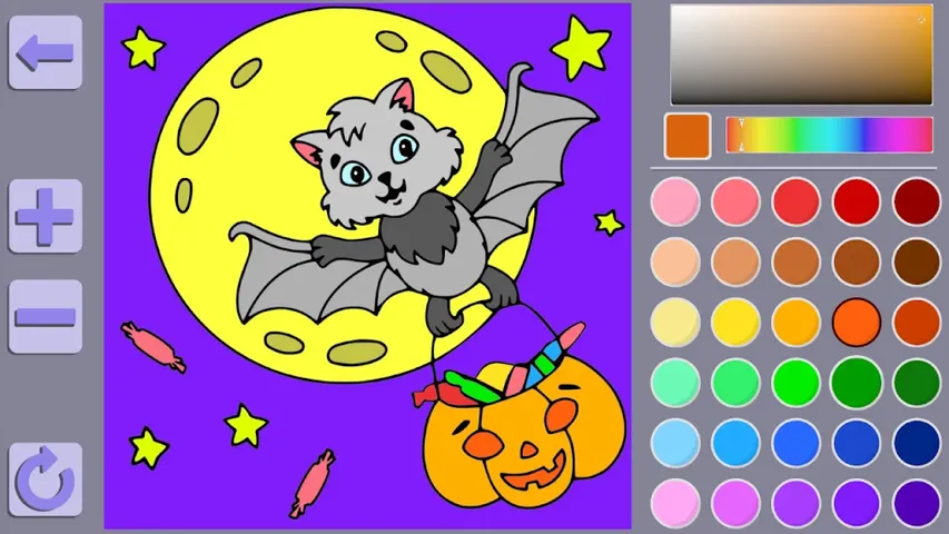 用明亮的猫和糖果为书籍万圣节着色。您可以画:南瓜、蝙蝠、猫和许多糖果。使用提供的调色板选择颜色,或自己制作独特的色调。不要错过任何细节!