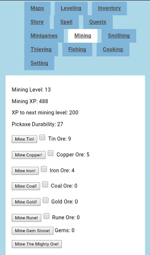 Dungeon RPG Clicker 就是关于耕种和在游戏中推动你的高分。该游戏是 100% 免费的,游戏中的所有东西都是免费的,可以在游戏中获得!我们正在努力使 Dungeon RPG Clicker 成为一款出色的点击游戏。但 DRPG 不是闲置(afk)唱首歌游戏,因此您必须处于活动状态或让游戏在后台运行。 特征: 技能 - 采矿、锻造、烹饪、钓鱼和盗窃。还有更多! 赌 重生 铁杆 - 如果你死了,你就死了! 在游戏中你应该知道的事情: 每 5 分钟你会得到一个神秘盒子! 您每小时都会获得一个传奇神秘盒子! HP是有上限的,所以要想通关更高的地图,就需要升级到更高的等级! str、int 和 dex 各有千秋! (隐藏着独特的力量) 笔记: Dungeon RPG Clicker 是一款低存储空间游戏,这意味着它不会占用太多空间,只有 0.63 MB,然后是“本地存储”,这使得游戏可以保存