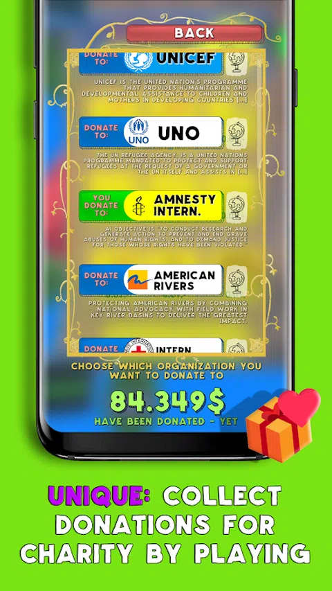 独一无二:通过玩游戏为你选择的慈善机构筹集资金。 在飞翔无尽的地平线的同时,通过快速的反应来引导慈善事业,借此机智地引导Flummy在冒险运动的流动喷气式飞机,弹射热气球,直升飞机,云层等平台上的道路。由您的六大超级大国支持,每天都会遇到新的遭遇,每次都会进一步发展。 无论你在深夜玩耍,月亮引导你的方式,或者在华丽的日落时间(实时)。 平衡Flummy在天空中的甜蜜气氛和挑战性的行为保证让您有所挂钩! .可能会让你把你的设备放在房间里。 但谁在乎? 因为真正的独特之处在于,你将能够通过玩耍来收取慈善金钱。一个慈善机构,你可以选择自己。 Flummy是100%免费 - 所以去吧,玩得开心! 我们希望你会喜欢我们的免费游戏,深深地感谢任何反馈! 游戏功能: - 一个简单的模式,不用担心! - 数十个定制角色在整个游戏中解锁,更多来了! - 6解锁和升级的能力 - 5个解锁设备,提升你的进步 - 包含点,升级,字符等的许多礼物 - 每个设置/配置都是100%。没有什么是必须的。根本没有薪水。 - 美丽的自定义自定义和编程的3D用户界面 - 使用自定义音乐实时定时的白天 - 易于学习,难以掌握一个按钮控件,以便随时随地播放任何地方。 - 可选和匿名调查,所以我们知道要改进什么