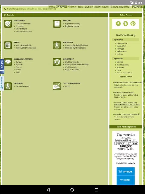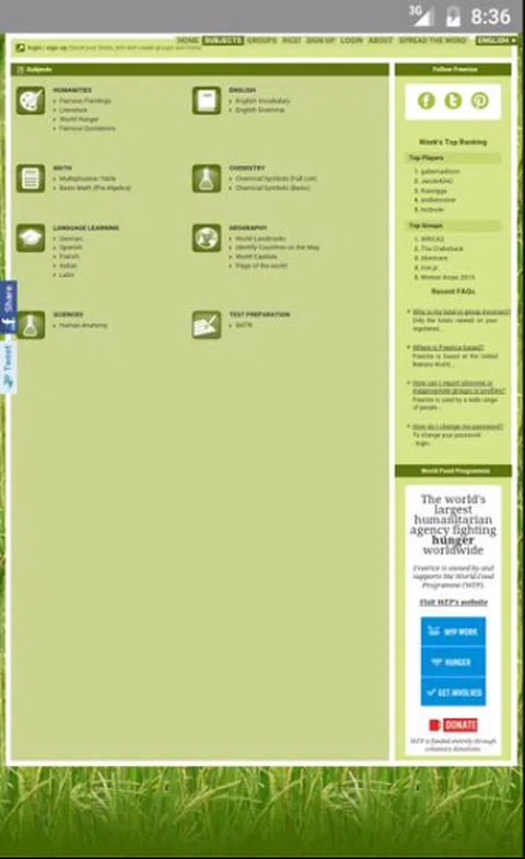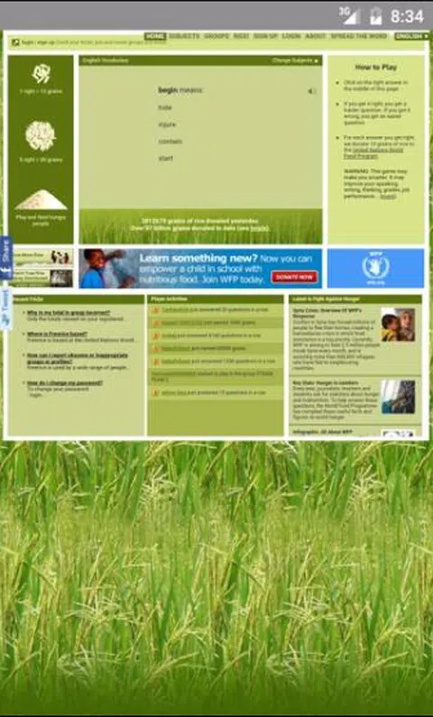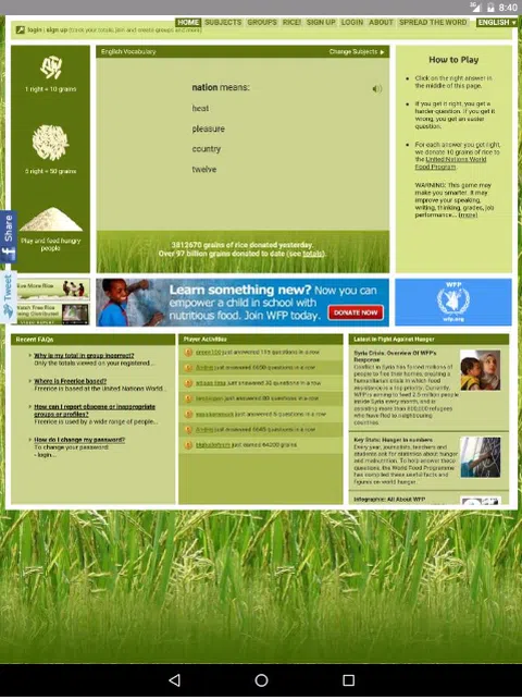 Freerice 是一个非营利性网站,由联合国世界粮食计划署 (WFP) 拥有并为其提供支持。 Freerice 有两个目标: 1. 为所有人免费提供教育。 2. 通过向饥饿的人们免费提供大米来帮助结束世界饥饿。 这要归功于在本网站上做广告的赞助商的慷慨捐助。 无论您是一家大公司的首席执行官还是贫穷国家的街头儿童,改善您的教育都可以改善您的生活。这是对自己的一项巨大投资。 也许更大的是您捐赠的大米对饥饿的人类所做的投资,使他们能够发挥作用并提高生产力。在世界的某个地方,一个人正在吃你帮助提供的米饭。 每回答一个正确的问题,就会向世界粮食计划署捐赠 10 粒大米,以帮助养活饥饿和贫困的家庭