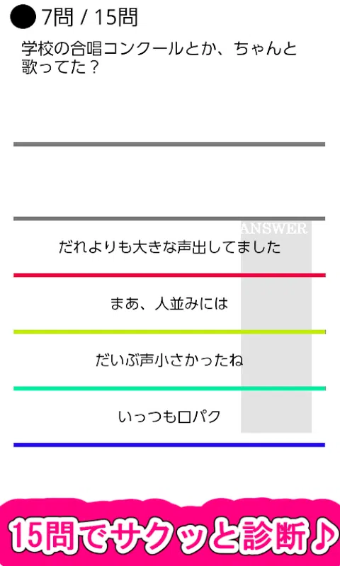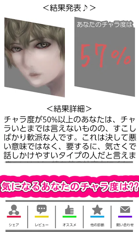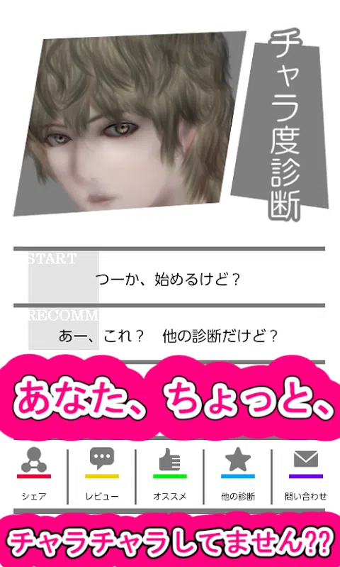 “慈善诊断”登场! 一个对异性敞开心扉,心地轻松的“仙女”。 老实说,是我非常喜欢和分手的角色(~_~;) 这就是为什么重要的是要知道你是否调情!(+o+) 所以我们准备了 ☆《慈善诊断》☆(*^)v 只需回答15个随机心理测试,您就会知道自己的天赋!? 题目的内容很“认真”,是女生都可以玩的app(^v^) 你可以选择你自己的角色! 或者你可以让你的调情朋友来做! 嘿你在☆你想和这家伙一起玩吗?ヽ(^。^)ノ [推荐给这样的人! ] ☆ 我担心自己的“challah degree” ☆ 我想用它来创建话题 ☆我经常做心理测试、算命和诊断 ☆对心理测试、算命、诊断感兴趣 ☆ 我想打发时间 ☆ 睡不着,有空闲的时候 [配备分享按钮] 您可以在 LINE、Twitter、Facebook 等上与朋友分享。 您也可以让您的朋友告诉您,它也非常适合创建主题。