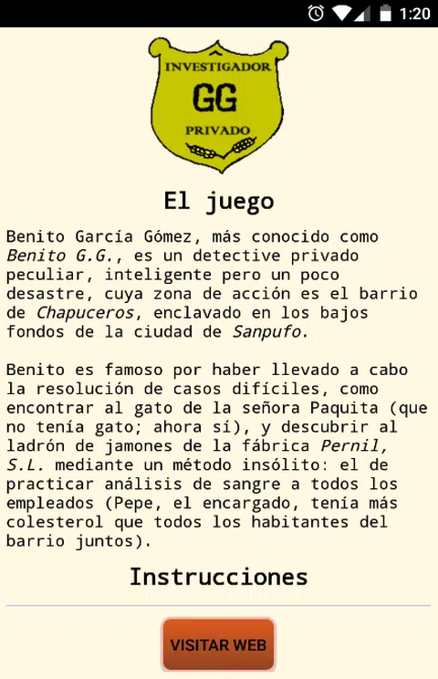 贝尼托·加西亚·戈麦斯,更好地为贝尼托G.G.,是一个古怪,聪明的私家侦探,但有点灾难,作用面积为笨蛋附近,在城市Sanpufo的设置。 在日常工作中,贝尼托casposos必须处理流氓,小顽抗歹徒,多疑老人和其他一些神秘的坚不可摧。 贝尼托是著名的有开展疑难案件,如发现猫Paquita旅馆夫人的决议(没有猫;现在的我),并发现火腿贼Pernil厂,S.L.一个不同寻常的方法:练习验血所有员工(佩佩,经理,他比附近的所有居民较多的胆固醇在一起)。 为了打击犯罪,贝尼托具有最佳的侦查技术,以及最新的技术。最后一个能与他们的利润越来越少买,当然。幸运的是在CarroFull一个很好的协议,如果没有,你告诉我他是如何去解决的打字机Oliveretta他的祖父。 在谁拥有绝对最令人垂涎的标题和几个奖项是笔迹和Papiroflexia加州大学洛杉矶分校获得的文凭(Conquense大学毕业生Asturianos),但同样重要的是,他的犯罪和花边的学士,发出通知,距离Massaxuxes大学。 总之,贝尼托是公会的羡慕。公会的热情好客,当然,因为它使鹰嘴豆三明治面条,消除你的呼吸。难怪。 在游戏中,你指导贝尼托案件的分辨率,同时在附近转悠,寻找作案的明确无误的气味将呈现。 邻居和其他人会帮你弄糊涂,所以相信自己的直觉侦探,因为这将是解开所有的奥秘你最好的武器。 祝你好运,需要它