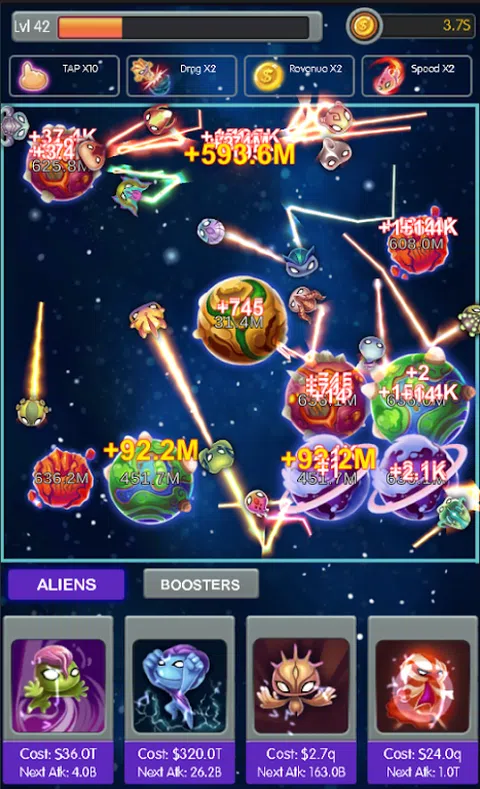 作为英雄控制外星人摧毁所有星球。打开更多的外星人享受更多的乐趣。 怎么玩: 1 - 点击行星进行攻击 2 - 隐藏外星人来帮助你 3 - 更新外星人以获得更多伤害 4 - 杀死所有星球以赢得关卡 升压系统: 1 - 点击增强:点击伤害 x10 2 - 双倍伤害:x2 所有外星人伤害 3 - 双倍收入:x2 钱 4 - 双倍速度:所有外星人的 x2 速度。 玩的开心