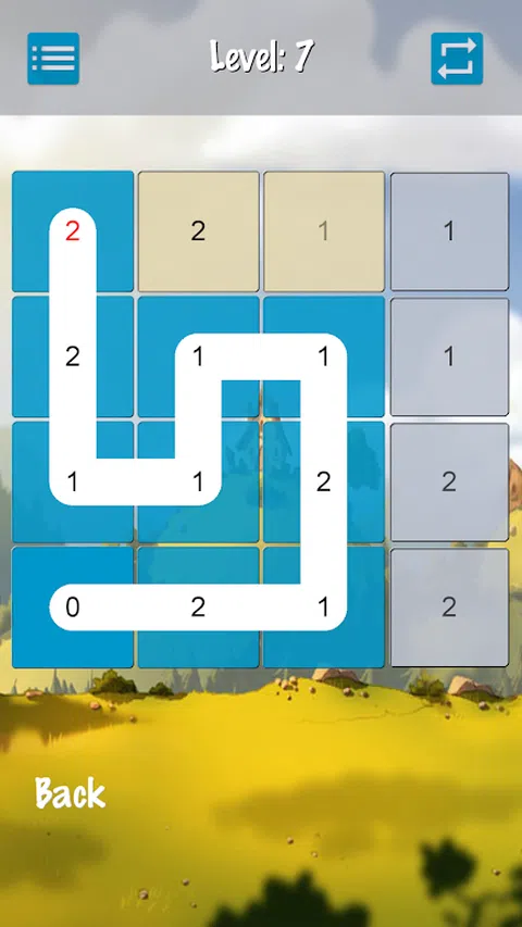 逻辑益智游戏。 用一条连续线填写该字段的所有单元格。 目标 - 用一条连续的线填充该字段的所有单元格。 游戏规则: - 从 0 开始,在每个网格中水平和垂直移动,恰好访问每个方格一次。 - 当您触摸 1 - 单元格的背景变为蓝色。 - 当您触摸 2 时,您会沿相同方向滑动到下一个单元格。单元格的背景变为蓝色。如果下一个单元格不存在,则不可能取得进展。 - 每一步都从最后一个填充的单元格开始 - 红色数字。 - 你不能穿过单元格或玩对角线游戏