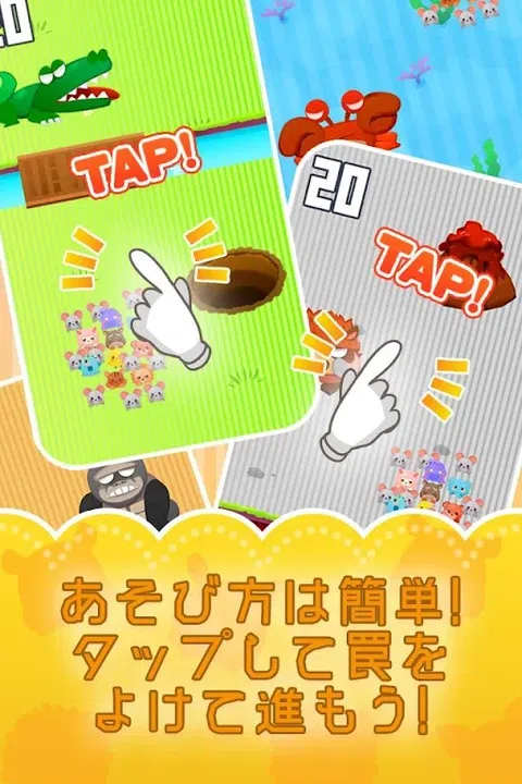 从小孩子到大人都可以享受的简单动作游戏! 很多可爱的动物出现了! 一路上有很多陷阱和敌人。 好好躲避并瞄准目标! 从简单到困难有很多阶段♪ 旋转扭蛋(免费)并获得大量角色