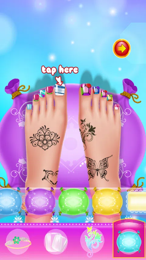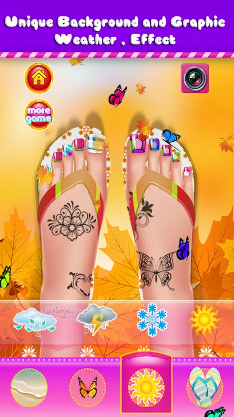 您的双脚将得到足部水疗护理 你的指甲会很漂亮,有很多物品和工具供你选择 并创造 你可以用这些很棒的纹身来装饰你的脚 戴上可爱的手镯或者漂亮的人字拖 最后你可以选择最美丽的背景与天气效果,如秋天。冬天。风雨兼程,才能拍出许多美丽的照片