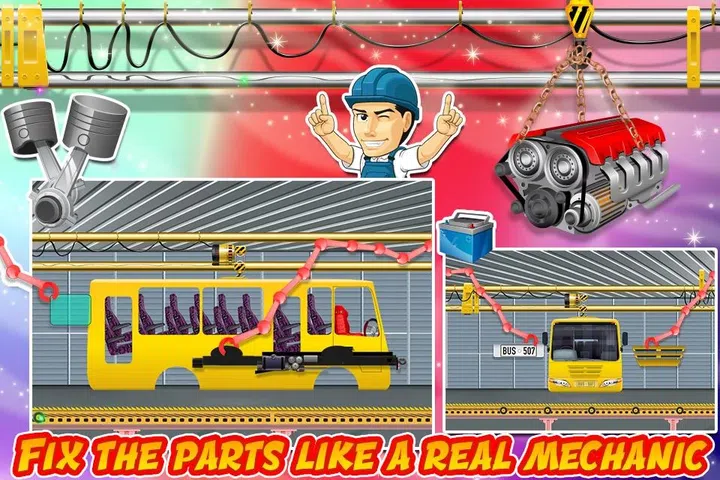 在汽车制造商和卡车工厂模拟器游戏成功后,儿童游戏工作室自豪地提出了汽车工厂生成器游戏。现在玩和享受虚拟生成器游戏在现实的工厂模拟。 喂小心!它的驱动程序总线构建器驾驶时间。你曾经梦想通过使用你的修理和建设技能创建自己的公共汽车和卡车吗?想成为汽车制造商和技工?你在正确的地方。作为一个移动巴士设计师,创造者和制造商在这个汽车工厂和制造商模拟器游戏的超疯狂力学。搭建公共汽车就像你在这个卡车制造商车间使用现代机械和工具建立迷你跑车和赛车。所以?你在等什么?开始行动,开始制造,创造和设计重型车辆。 司机正在等他们的校车和客车,赶快!是城里最好的汽车修理工
