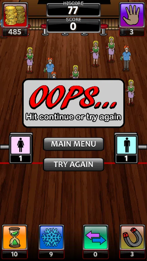 当你该走时,你必须走。通过向左(女性)或向右(男性)滑动来引导人们上厕所。 当醉酒在路上时,然后向下滑动将他扫出场地。 人们会提示您引导他们上厕所,因此请收集这些以购买助推器并解锁新场地。 如果事情变得太快并且您可以击退,然后向上滑动以击退人们。 有 4 种提升可以帮助您完成任务。 减速:这将使所有当前前往厕所的人减速。 冻结:这将在有限的时间内冻结所有走向厕所的人。 自动收集硬币:这将自动收集所有提示。 自动引导人员:这将引导所有当前的步行者到厕所。 引导尽可能多的人上厕所以获得比你的朋友更高的分数