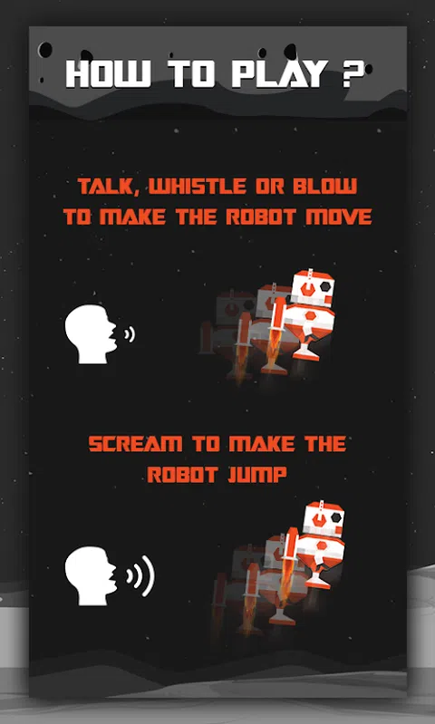 Robot scream 或 Robot Scream Go 是一款语音控制的尖叫游戏,您的机器人会随着您的声音移动。 机器人被困在月球上,通过清除障碍和水平,可以到达火星和冥王星。 通过尖叫、通关和解锁这些行星来玩。 如何玩机器人尖叫? - 让机器人走路或移动说话轻声。 - 让机器人跳跃尖叫或吹口哨。 - 不要发出任何声音让机器人停下来。 是什么让这个游戏变得有趣? 语音/噪音控制趣味游戏 用你的声音清除障碍 收集硬币 更改字符 玩的基本环境是月亮 稍加努力就可以解锁火星和冥王星 令人上瘾的游戏 非常具有挑战性的游戏 最好的 Scream Go 游戏之一 您还可以调整声音灵敏度 所以发出一些声音