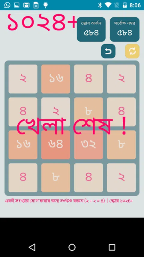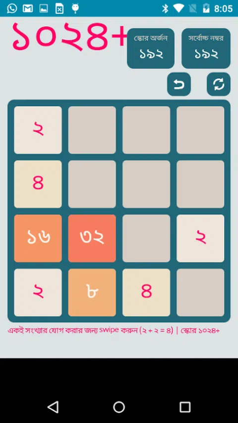 充满乐趣和最完美的孟加拉语 1024+ 游戏数字益智游戏 Android 版(免费) 游玩方向: 1. 玩家必须向各个方向(即上、下、左、右)滑动才能移动图块。 2. 相同数字的图块只有在接触时才会合并为一个。 3.当达到2048块时,玩家获胜! 8. 16. 1024.