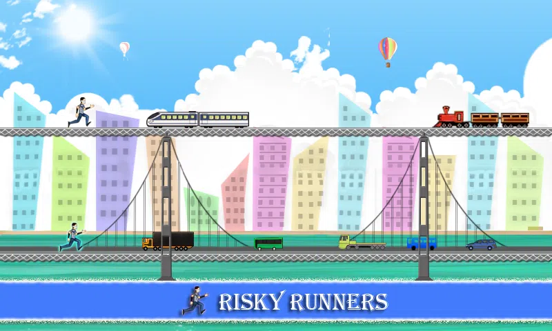 两个男孩发现一名乘客从行驶中的火车上掉下来,吊在桥上并大声呼救。男孩们决定冒险营救乘客。 如何玩 Risky Runners? 左键—第一个跳过轨道上火车的男孩。 右键—让第二个男孩跳过路上的车辆。 你的任务是什么? 冒险的跑步者应该拯救乘客