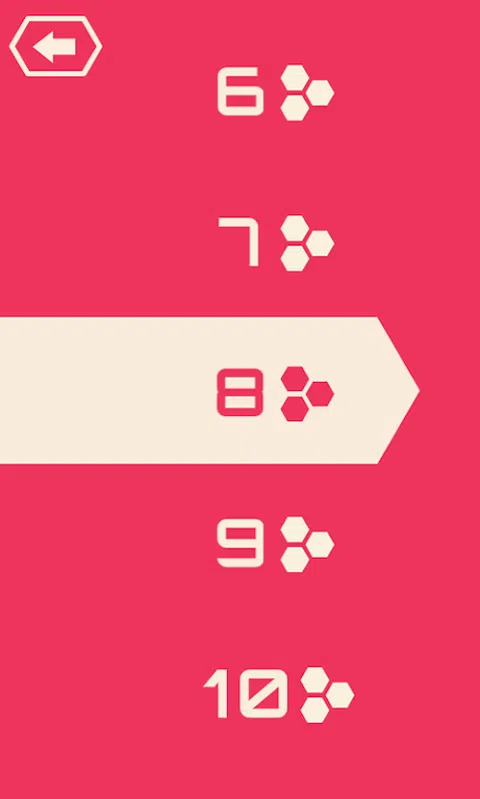 Jacinth 六边形和红色六边形彼此相邻。如果您点击其中一个,旁边的其他六边形将变为相同的颜色。 您需要做的是在有限的抽头内将所有六边形更改为白色。 每个级别都有不同的有限水龙头。此外,在消耗所有水龙头后,您将获得 10 次机会。 共有10个级别,附属200个级别。随着您在游戏中花费更多时间,难度会增加。 立即下载以挑战自己