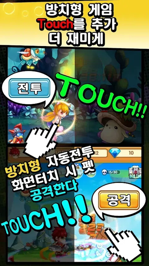 【愚蠢的空闲RPG】 首次引入触控概念,在触屏的同时打造传统的放置游戏 传统RPG系统自动战斗和离线奖励可用 【疯狂触摸轻松击败BOSS】 轻触剧情,无触碰限制,限时挑战BOSS和魔王,触碰速度提升的那一刻,疯狂触碰~ 【当阳成长系统】 传统的放置游戏系统,基本物品代替遗物、特质、宠物和星光 丰富的成长系统,享受闲置游戏的乐趣。 【收集卡片,打造强大的英雄】 击败魔王后可以获得很多碎片,通过喊话可以获得很多增益。