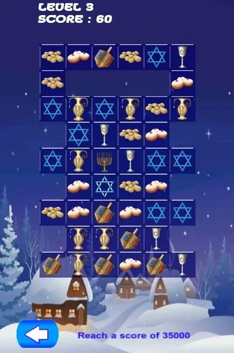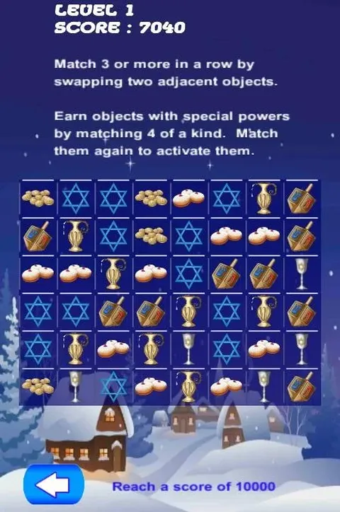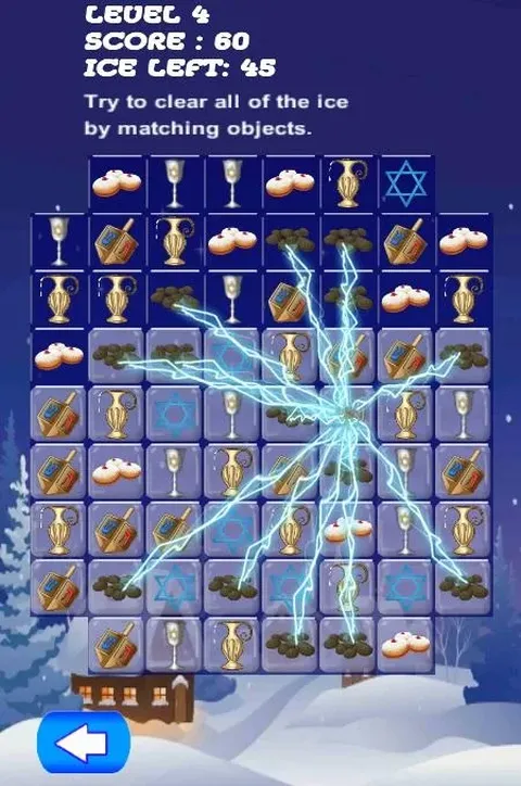 陀螺和甜甜圈。 匹配 3 个或更多光明节主题物品,将其移出游戏区域并得分。 匹配 4 个或更多并接收具有特殊能力的物品。 通过匹配并移除冰块顶部的物品来融化冰块。 如果您遇到困难,帮助功能会向您显示可能采取的行动。