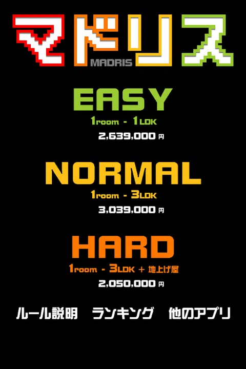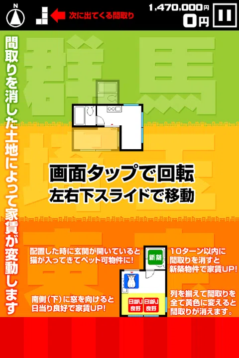 一款俄罗斯方块风格的益智游戏,以平面图的形式排列和擦除积木。 对齐行并将平面图的整个范围变为黄色,平面图将消失。 租金(分数)取决于平面图被拆除的位置(土地)、新建筑、良好的阳光和允许的宠物。 从1room到3LDK的各种房间!请擦好,瞄准地产大王