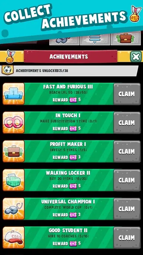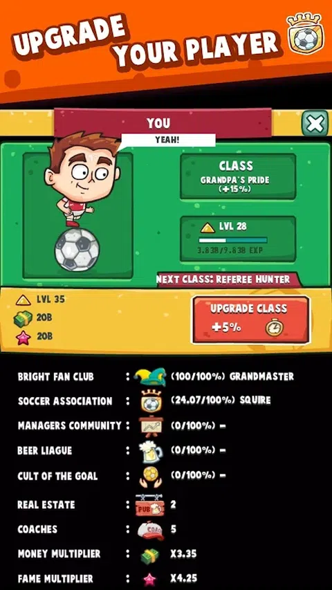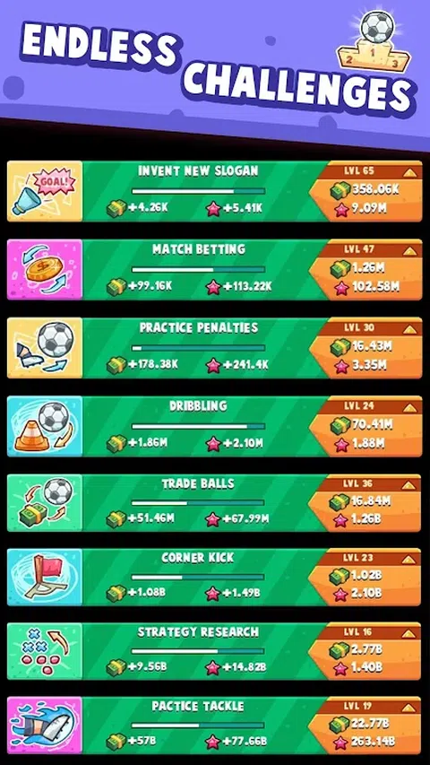 你是否为足球而疯狂?你是否喜欢点击式游戏和放置类 RPG 冒险?如果答案是肯定的,那么你绝不能错过 Soccer Simulator!跟随足坛传奇人物的脚步,从街头足球进入职业球队,赢取名誉和荣耀。这款游戏可以让你回忆起旧事,那时的你也许还理着杂乱的发型、踢着祖父破旧的足球。在这款好玩的点击类足球游戏中逐步成为足球明星。现在你不再为了饼干踢球了,而是为了名声与财富! 白手起家 作为一名专业的足球运动员,要实现自己的远大理想,你需要考虑很多东西。从公司雇佣最好的教练可以加快获得成功的速度。完成任务可以提升技能并积累名声和财富。金钱的积累速度很快,你可将其用于升级你的装备等等!是否想要拥有一家具乐部或体育场?没问题。一直想要一台酷炫的跑车?买一辆开着到处炫就行